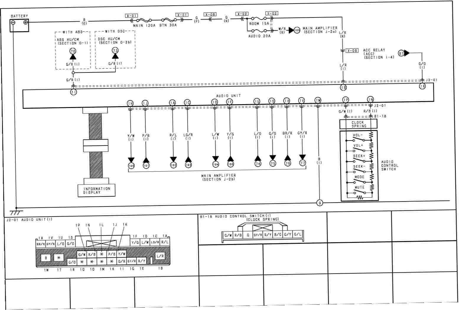 PIN APPLICATION 2003 Miata 2003 Miata Bose 2003 MPV 2003 Protege 2004 RX-8 A Left Front + Yellow/Red Red Blue/Orange Black/Red Red/Blue B Battery (+12V) Blue/Red Blue/Red Blue/Red Blue/Red Blue/Red C Left Front - Yellow/Black White Violet Black/White Light Green/Red D Right Front + Yellow/Green Yellow White/Red Red Blue/White E Pulsed Dimmer (TNS+) Red/Black Red/Black Light Green/Blue Light Green/Blue Red/Yellow F Right Front - Green Orange White White Yellow/Green G Inverted Dimming Grey/Red Grey/Red White/Blue White/Blue Grey/Red H PWR Ant Grey/Black Grey/Black Yellow/White I Speed Pulse Green/Red Green/Red J Amp Remote Light Green/Black White Yellow (woofer?) Purple/Blue K Nav: Parking Brake Yellow/Green L Telephone Mute M Nav: Reverse Blue/White N Clockspring/Wheel Controls Grey/Black Red/Black O blank P Clockspring/Wheel Controls White/Green Green/White Q blank R IGN (+12V switched) Blue/Black Blue/Black Purple/Blue Purple/Black Green/Orange S Left Rear + Green/Orange Brown/White Green/Orange T blank Black/White U Left Rear - Green Brown Blue/Orange V Right Rear + Yellow/Black Green Grey/Red W Ground Black Black Black Black Black X Right Rear - Purple Green/Orange Brown/Red