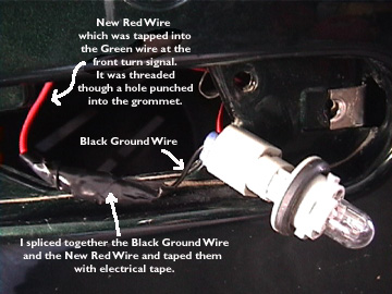 Next remove the front turn signal/parking lamp assembly. You will see three wires going to the single lamp in the assembly. Black is ground. On my car green is the turn signal, and the other wire is the parking lamp. Carefully cut about 1/2 inch of insulation from the green wire. DO NOT cut the wire, just the insulation from it, so about 1/2 inch of bare wire shows.