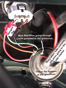 Next flip up your headlights. Under the headlights you will see a rubber grommlet with a wire going through it to the side maker light. Either put a small hole in the grommlet or peel a side of it away, so you can feed a wire down throught it. This is the wire that you are going to attach to the ground wire of the side marker light that you cut earlier. Again,the wire MUST be attached to the wire oing to the bulb, NOT the wire feeding back into the harness.Splice the two wires together and tape them up. If you wish you can solder them as well, but it is not necessary. Once the wires are connected, you can then tape all the wires back up and reinstall the side marker light.