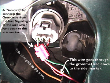 First remove the two phillips head screws from the side marker light and pull the light assembly out. You will see two wires attached to the lamp. Cut the black (ground wire) about 1 1/2 inches from the lamp.You will probably have to cut some of the plastic tubeing around the wire to get the 1 1/2 inches. In order for this to work, you MUST CUT the wire. Splicing into it will not work.