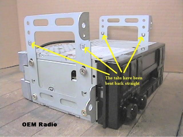 3. If you do not have the OEM CD player and your radio is mounted in the top position of the mounting rack, you probably have a cross brace connecting the two sides of the rack at the bottom. You will not use this cross brace. Disassemble the mounting rack but notice which side is left and right and keep the proper orientation. Each side of the rack has 4 tabs bent inward to fit corresponding slots in the radio case and the OEM CD player. You can mount the Sony on the top or bottom but it really needs to be on top because gear shifting would interfere with the inserting and ejecting of the CD disc.