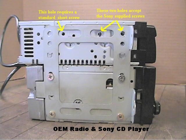 6. The Sony comes with a face plate trim piece and a mounting sleeve. You will not use either of these. There are several holes in each side of the Sony, 5 of which are made to accept the Sony mounting screws in the package. Hold the Sony in the top position of the OEM mounting rack and align it with the radio in the bottom position. When you line up the face of both units you will see that one forward mounting rack hole and one Sony mounting hole line up perfectly on each side. The others do not; however, one smaller vent hole on the Sony does line up with the slot cut in the OEM mounting rack. You can use the Sony supplied screws for the front holes and obtain 2 large head but short screws of the proper size to fit the vent hole on each side of player. Mount the Sony in the rack.