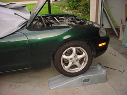 The hard part was getting the new, larger bar in. Many people have a hard time getting it back in, usually because if you insert it from the passenger side fender area, the bar can't get over the lower radiator hose. Every time you try and raise one side of the bar, the other side hits the ground and prevents you from raising it further. If you use the jack to raise the passenger side of the car a few inches, you can get more leverage to move the sway bar around and get it over the radiator hose. After that, I lowered the car back on the ramp. Don't do this if you don't feel comfortable or safe!. I figured even if the jack fell, it would land on the ramp (which was only 2 inches below the wheel). |