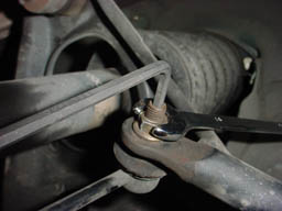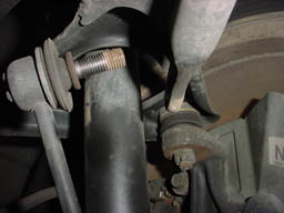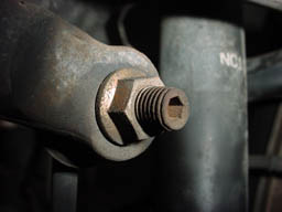 Step 10: Here is a snapshot of the end link bolt. Many people, including me, missed this and made it a pain, because you can usually get the nut off part way, but then the whole bolt begins to turn with a ratchet. You'll notice there's a hole here to place an allen key. |