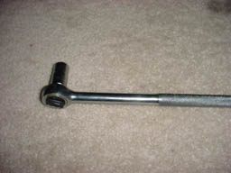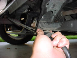 Remember this for when you put in the new bar. Take the ratchet and loosen the nuts on the end links; when I removed them, it took only a little amount of force. Facing the rear of the car, the passenger side endlink nut will be turned so that the top of the nut is turning away from you. So the ratchet handle should be moving upwards with the handle pointed to the back of the car. On the driver's side, it should be turning toward you so the handle should be moving down when facing out to the back of the car. |