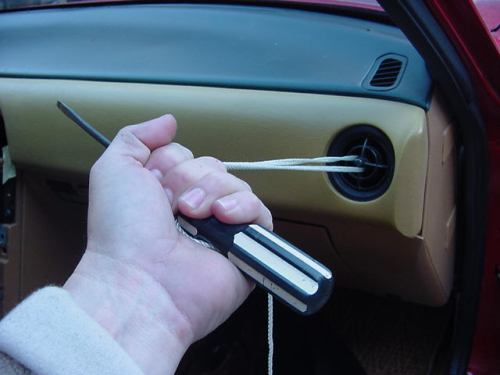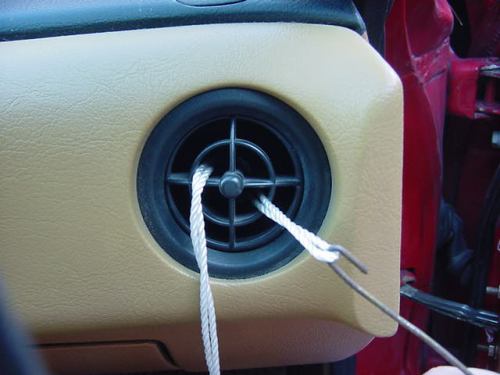 Once you have the center console removed and out of the way, you will need to remove the two far outside eyeball vents. These will be twice as hard as the middle ones. Using the string method: