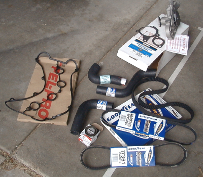 Unfortunately, there is more to be done than replacing a belt. Many of the other parts are old enough to consider replacing also, especially since most of the same disassembly must be done. I chose this list: water pump, auxiliary and serpentine belts, major radiator hoses, front camshaft seals, and valve cover gasket.
