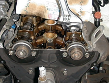 Give the cover some gentle mallet taps to loosen it. Don't be in a hurry; it isn't likely to be stuck down very hard, it just needs to get some air under the seal. Now you get to see some of the innards of your engine. If you're like me, you probably waited until it was time for an oil change, before opening the engine. So the cams won't look as shiney as the picture in the manual. We'll want fresh oil in there when it's all back together.
