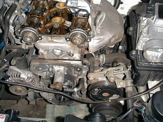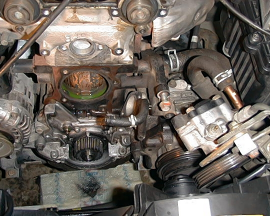 Here you can see the outer timing belt covers, accessory belts and the water pump pulley have been removed: