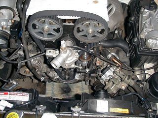 Take off the various covers and keep the screws with them. The water pump pulley comes off easily enough, but it has to be kept from turning. I wedged a grippy block between the pulley and the water intake tube.