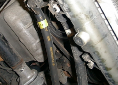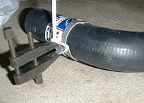 One thing you'll find is that those 'quick release' clamps on the radiator hoses are only quick releasing if you can hold about a hundred pounds of force on a snap ring while wiggling it sideways. Slip lock pliers work OK, but if the clamp is rotated with the tabs somewhere inaccessible, it's going to be a struggle to bring the tabs to a position where you can get pliers on them. A machinist's clamp or a screw type pinch clamp could be a handy tool, allowing you to lock the hose clamp in a fairly open position while you move it off the hose end and into the middle of the hose. Vise grips are O.K. too, but it takes a lot of luck to get a good latch on the clamp while not running the Vise grip handle into something. With some reluctance, I cut one of the hoses to make it easier to remove ' don't scratch the metal hose fitting. Putting the hoses back on is easier than taking them off, but the opposite is true of the clamps.
