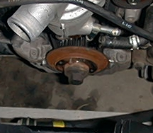 Removal of the crankshaft pulley will reveal the timing belt retaining disk and the big crankshaft screw, which you will have fun with soon enough.