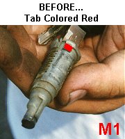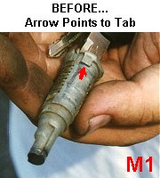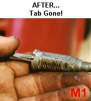 Once again I must stress: DO NOT ALLOW THE KEY TO COME OUT! Clean any excess grease off of the tumbler. Examine the tumbler and compare with the photos below to determine which tab needs to be removed. Use a Dremel or similar tool to grind off the raised tab shown in the photos. WEAR EYE PROTECTION WHILE GRINDING!