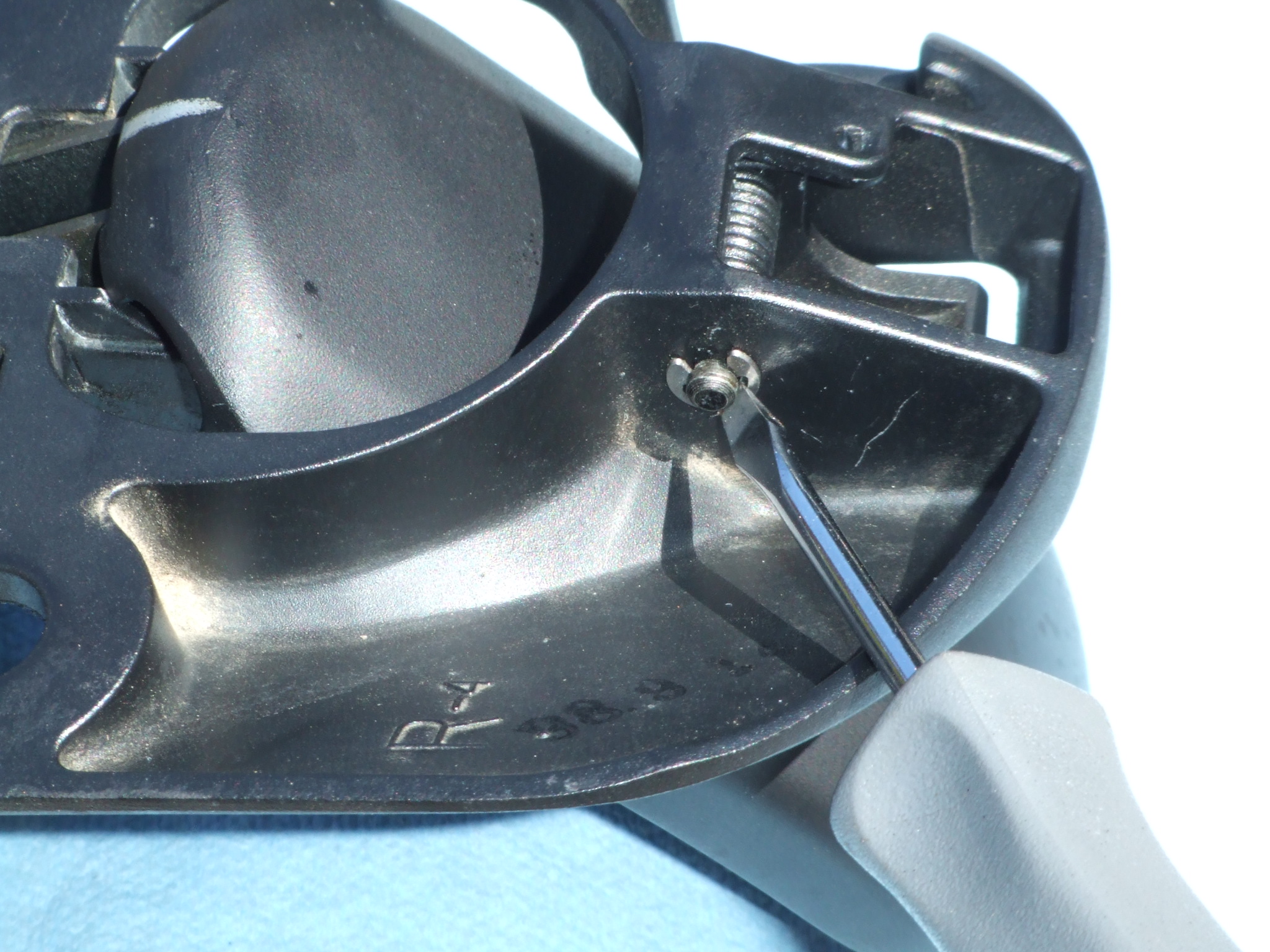 First, lower your top and undo three #3 Phillips head screws to remove the latch. If you use a #3 (large) screwdriver the screws should come out easily without marring. Once it has been removed, turn it over. Pry off the E-clip from the lock pivot pin. E-clips love to fly off and seek asylum in the remotest corners of your garage, so use caution while removing. You might want to remove the clip while the entire assembly is inside a large plastic bag.