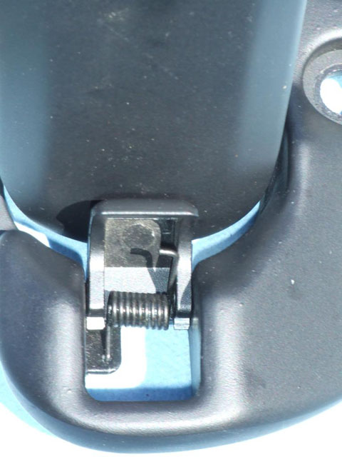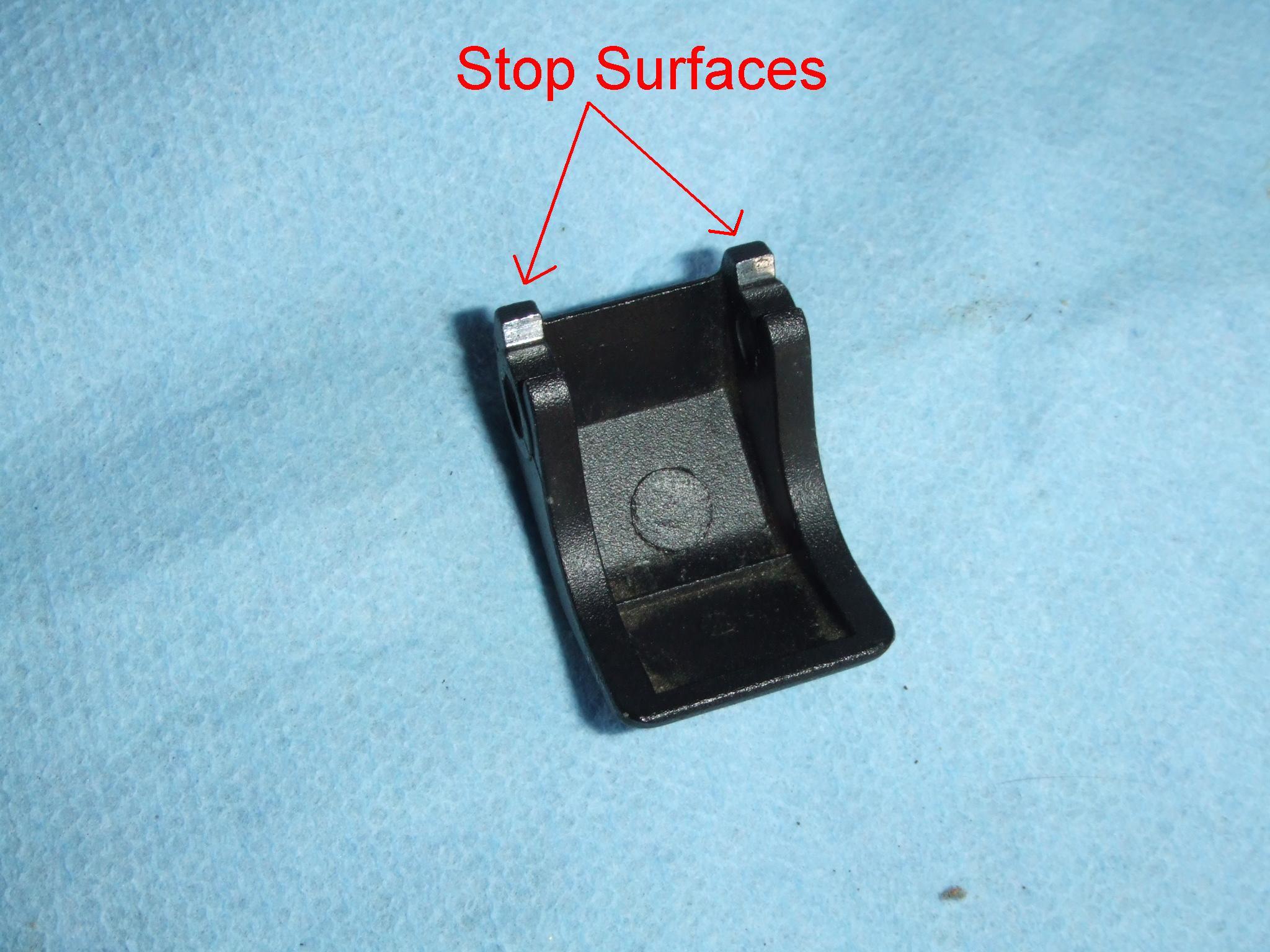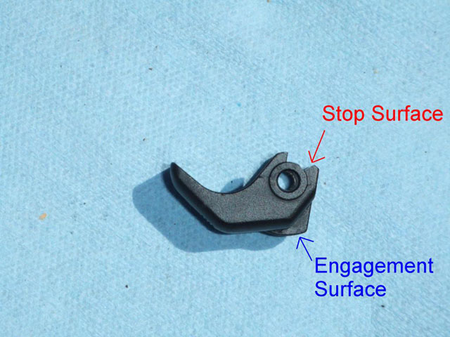 On a properly machined latch, the lock and the lever will engage. On a defective latch, the stop surface contacts the stop ledge in the latch housing before there is sufficient engagement to lock properly.