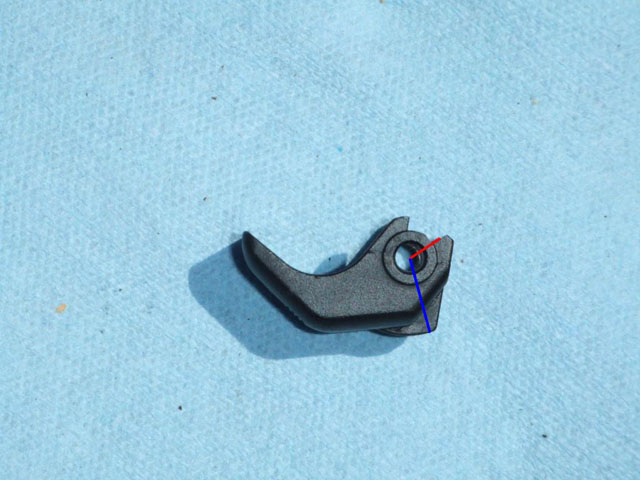 Note that the distance from the center to the engagement surface (blue) is about three times as far as the center to stop surface (red). This means that a small change in the stop surface will result in a large change in the amount of rotation of the engagement surface.