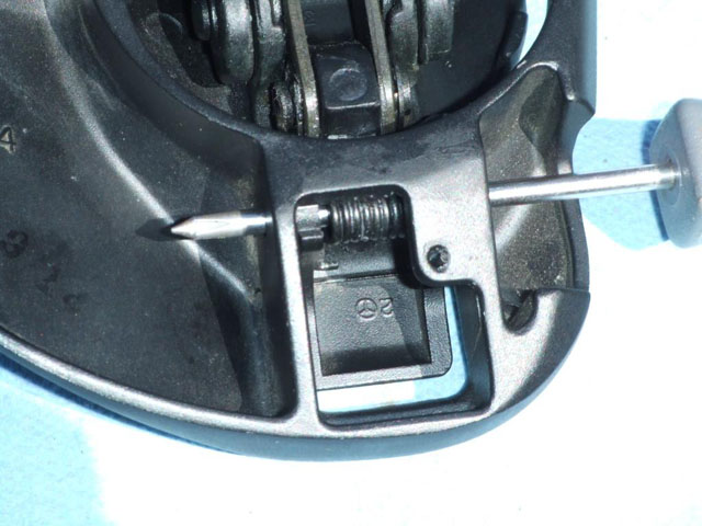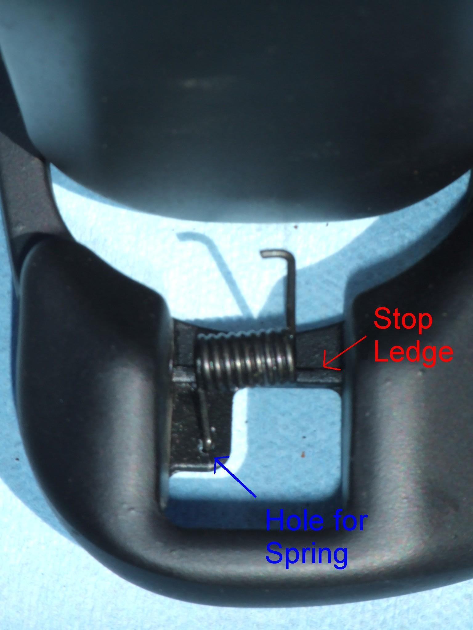 Place the lock button in place behind the spring. Rotate it into its normal position; making sure that the stop ledge is between the stop surfaces and the spring.