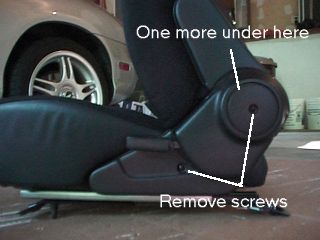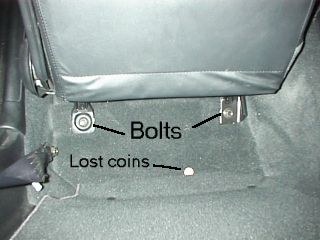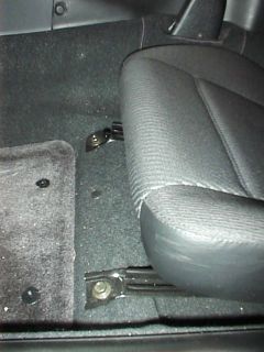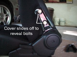 bolts in the front of the seat tracks. If there are covers over the bolts, pop them