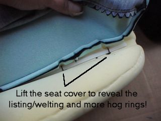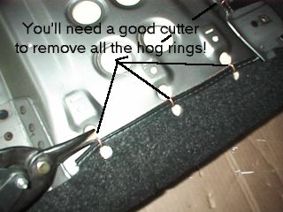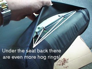 Both the OEM cloth seat covers and the new seats are attached to the actual seat mechanisms (the pan, foam, etc.) by upholstery staples known in the trade as hog rings. The seat cushion of the Miata is held to the pan and cushion foam by approximately 25 rings, and the back is held by approximately 35 rings. To remove the existing cloth covers, you will need to cut these rings.