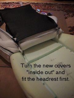 After the center is started you can move to the bolsters and finish up the job. The cover is now attached to the seat back. Make sure it is straight! Replace the headrest speakers, if any, and replace their cover. Be sure the cover is placed firmly under the seam in the cover so that it does not stick out. Find the best fit and zip the headrest cover closed. Your seat cushion and back are now both finished being covered.