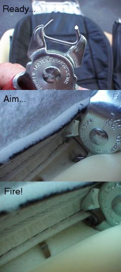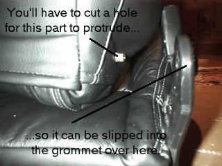 side of the seat back, there is a metal protrusion which will slide into the grommet. Cut