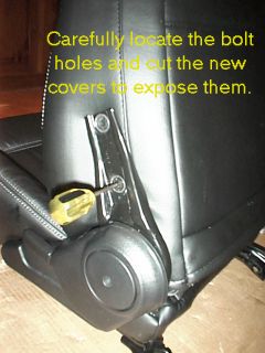 Now for the seat back. Start by unzipping the headrest of the new cover, and sliding the cover over the seat.(Again, skip this for the '99, since there are no zippers or headrest speakers.) If there are headrest speaker wires in the seat, be sure they are properly in place. Be sure you have the correct cover - the passenger seat is the one with the map pocket. After sliding the cover most of the way onto the seat, make a first pass at getting it straight. Turn the seat over and look at the way the back of the cover fits onto the seat back. Be sure all the seams at the edges line up with the actual edge of the back of the seat back. Then turn the seat back to the front. Look at the stitched seams on the edge bolsters and be sure they are even on both sides. Press the foam bolsters of the seat into the cover and pull the cover tight. Again, press and push until everything is straight and smooth. Continually check to make sure the cover is straight on the back. If you want, lay the foam insert back in the seat back and check the fit of the center panels - be sure the lines look straight. Also, before you start stapling hog rings, you might want to familiarize yourself with the location of the two bolt holes on the tilt arm side of the seat back, and the metal pivot rod on the other side. You will need to later make holes in the leather at these three locations.