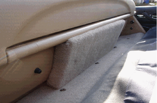 By locating the speakers in my stock windblocker between the seats, I could have the sound that I was looking for. So I purchased 2 4" Infinity two-way speakers and we went to work. I chose to match the stock carpeting in my '99 and keep the speaker grills on. Later if I choose, I can color match the grills and cloth to the windblocker itself. For now I like the way it looks and "WOW", it is probably the best sound I have had in any car, let alone a Miata with the top down! Here are pictures of the Audio Windblocker Modification: