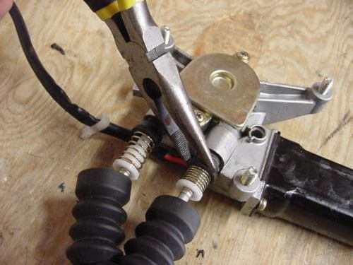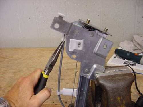 Working alone, I placed the window regulator in a vice and attached it to the flat metal window slider. I then decided to change my approach and went back a few steps and completely loosened the cable again by unplugging one of the ends from the slider. I placed the cable over the pulley end and turned my attention to the opposite end of the regulator that doesn t have a pulley but a half circle type guide. I placed the cable in the guide and as I just started to run out of slack I grabbed the cable sleeve end with needle nose pliers and pulled it down and was able to seat it properly.