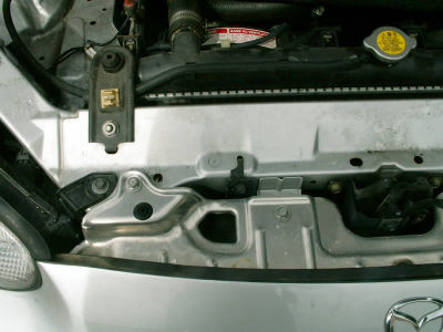 The horn bracket is in the lower passenger side of the engine compartment, in front of the radiator. From this view, all you can see is the top of the upper part of the bracket