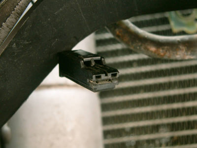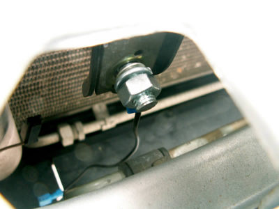 You can see the positive (left) and negative (right) terminals of the air horn. The stock horn has a positive terminal and connects to ground via its mounting stud. In order to use the new horn, a new ground connection will have to be created.